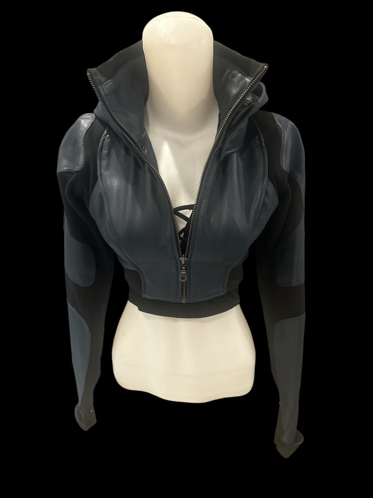 The Freq G Leather Hooded Crop Jacket with detachable hood is now available in Deep Blue. At the moment, there's only 1 Small available. Custom sizing is an option. There's an inside zip pocket, ribbing in the joints for better mobility, and everyone who tries it on says it has an amazing fit! Made of Leather and Cotton Ribbing.