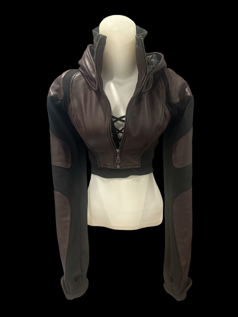 The Freq G Leather Hooded Crop Jacket with detachable hood is now available in Deep Burgundy. At the moment, there's only 1 Small available. Custom sizing is an option. There's an inside zip pocket, ribbing in the joints for better mobility, and everyone who tries it on says it has an amazing fit! Made of Leather and Cotton Ribbing.